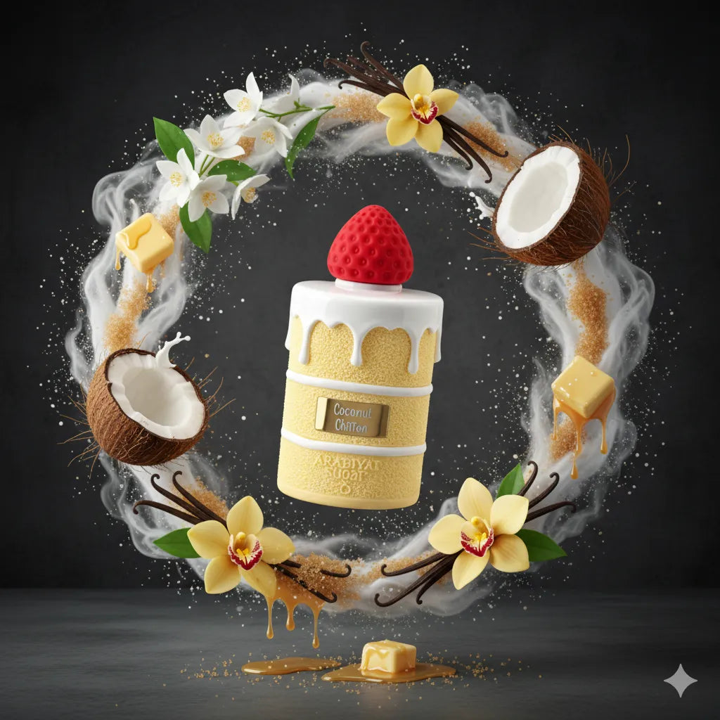 Float away on a cloud of airy sweetness with Arabiyat Sugar Coconut Chiffon. This fragrance is a delicate yet decadent gourmand experience, capturing the essence of a light, fluffy coconut dessert fresh from the oven.